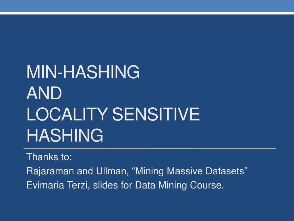 MIN-HASHINGAND LOCALITY SENSITIVE HASHING Thanks to: Rajaraman and Ullman, “Mining Massive Datasets” Evimaria Terzi, slides for Data Mining Course.