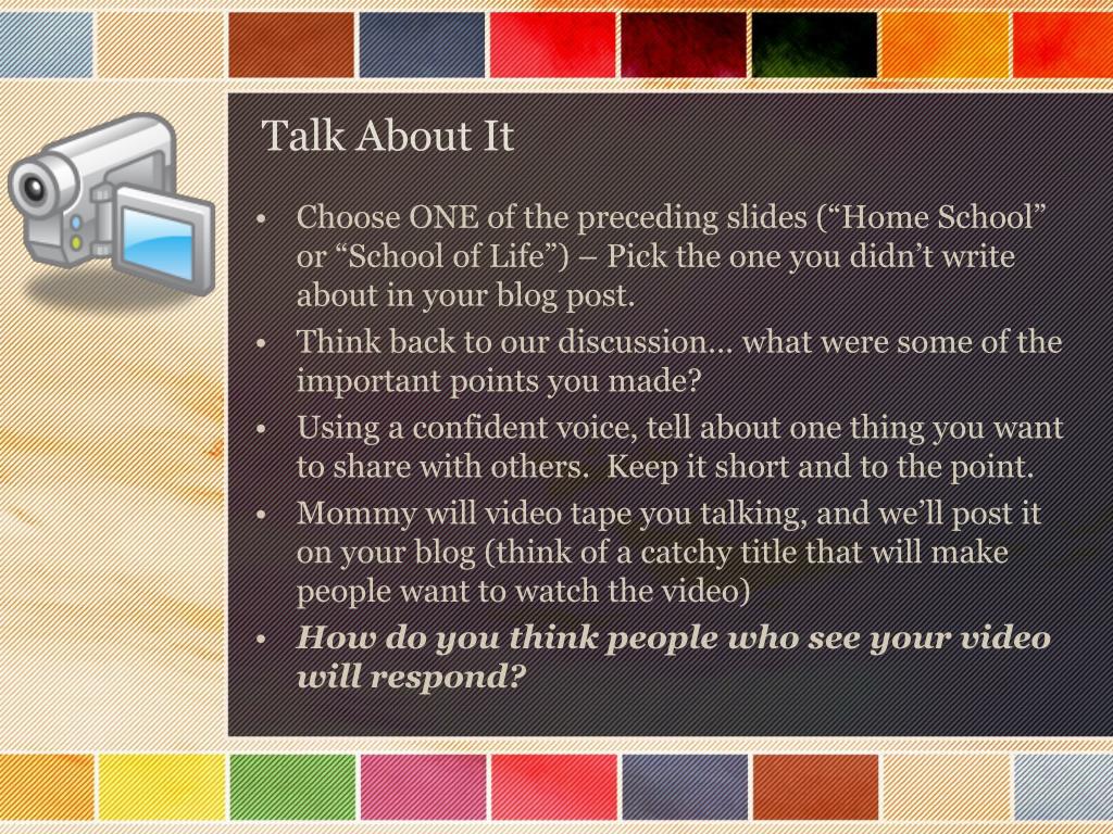Talk About It • Choose ONE of the preceding slides (“Home School” or “School of Life”) – Pick the one you didn’t write about in your blog post. • Think back to our discussion… what were some of the important points you made? • Using a confident voice, tell about one thing you want to share with others. Keep it short and to the point. • Mommy will video tape you talking, and we’ll post it on your blog (think of a catchy title that will make people want to watch the video) • How do you think people who see your video will respond?