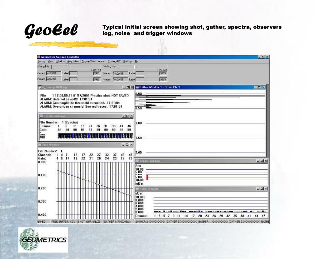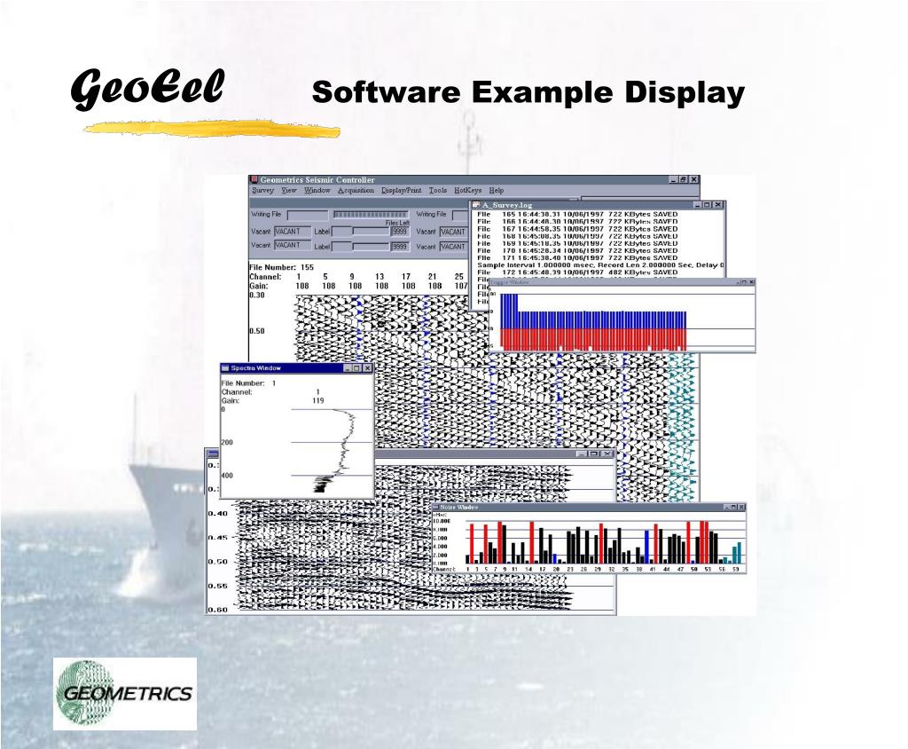 Software Features • Separate, Sizeable Windows • Shot • Multiple Simultaneous Gathers • Source Energy, Shot Timing • Noise Window • User definable alarms with adjustable thresholds • Drives multiple plotters for various displays