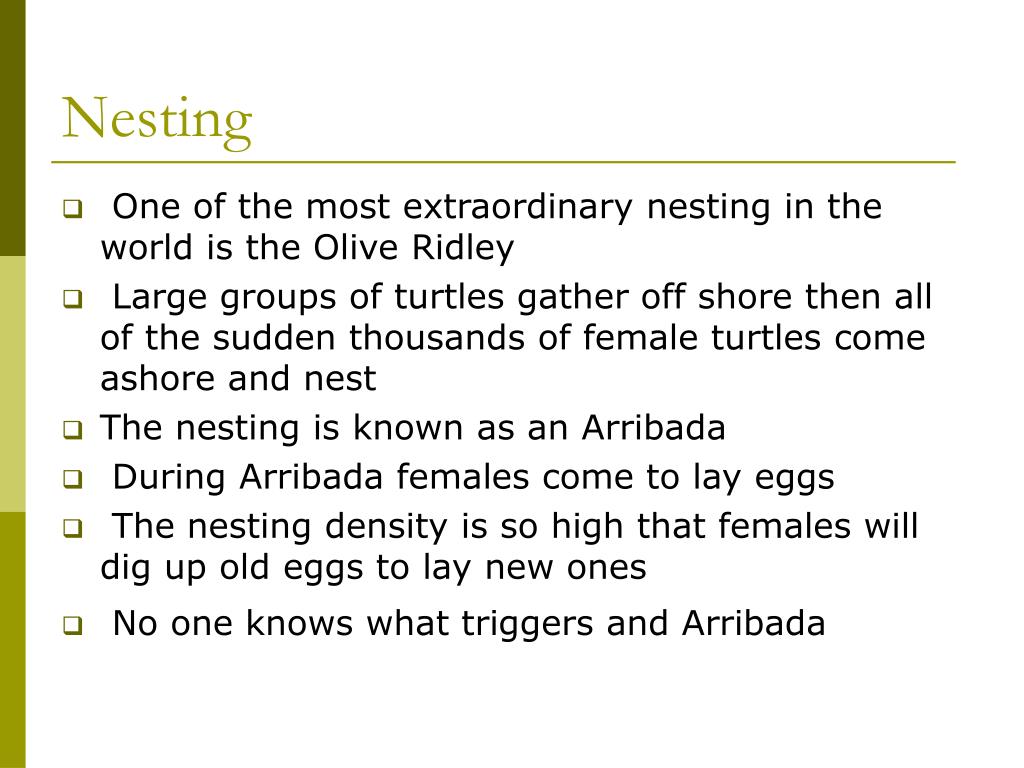 Nesting • One of the most extraordinary nesting in the world is the Olive Ridley • Large groups of turtles gather off shore then all of the sudden thousands of female turtles come ashore and nest • The nesting is known as an Arribada • During Arribada females come to lay eggs • The nesting density is so high that females will dig up old eggs to lay new ones • No one knows what triggers and Arribada