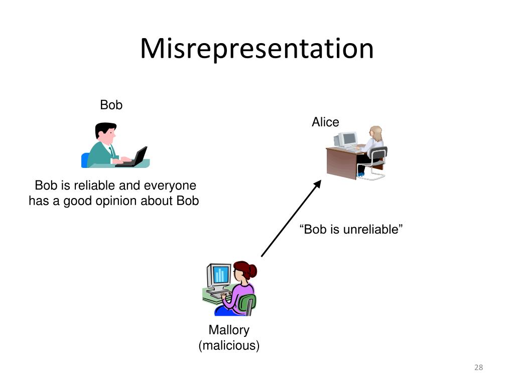 Misrepresentation Bob Alice Bob is reliable and everyone has a good opinion about Bob “Bob is unreliable” Mallory (malicious)