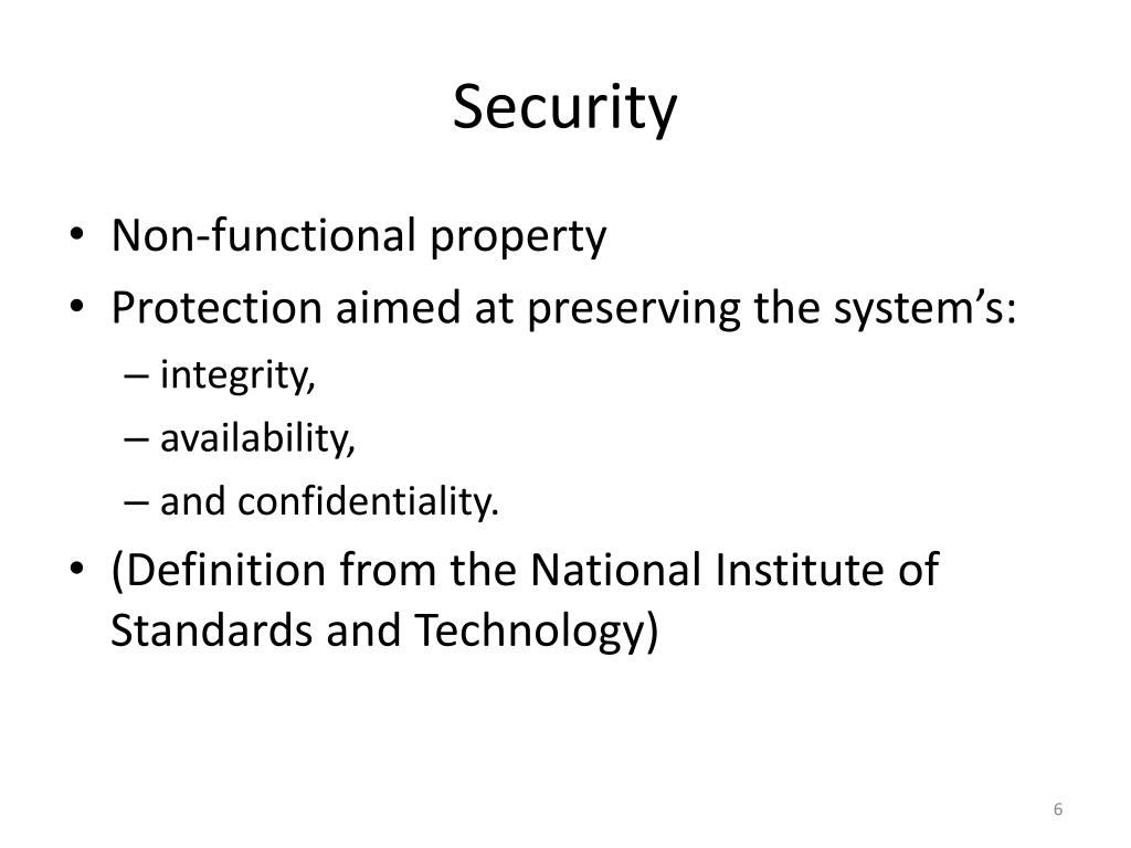 Security • Non-functional property • Protection aimed at preserving the system’s: • integrity, • availability, • and confidentiality. • (Definition from the National Institute of Standards and Technology)