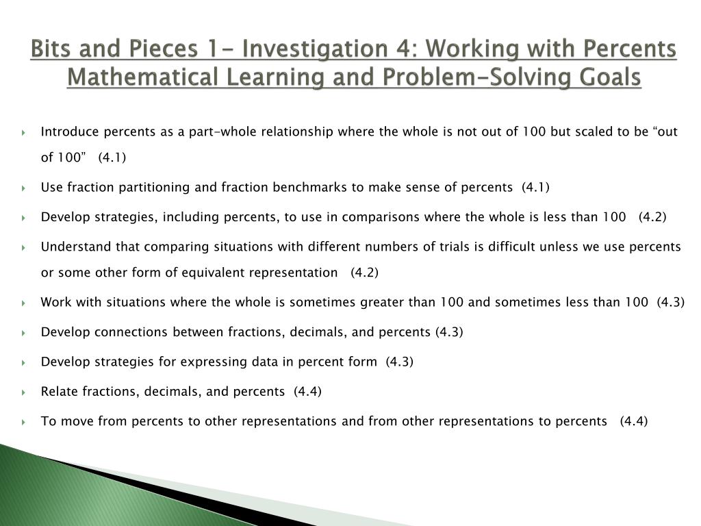 Bits and Pieces 1- Investigation 4: Working with PercentsMathematical Learning and Problem-Solving Goals • Introduce percents as a part-whole relationship where the whole is not out of 100 but scaled to be “out of 100” (4.1) • Use fraction partitioning and fraction benchmarks to make sense of percents (4.1) • Develop strategies, including percents, to use in comparisons where the whole is less than 100 (4.2) • Understand that comparing situations with different numbers of trials is difficult unless we use percents or some other form of equivalent representation (4.2) • Work with situations where the whole is sometimes greater than 100 and sometimes less than 100 (4.3) • Develop connections between fractions, decimals, and percents (4.3) • Develop strategies for expressing data in percent form (4.3) • Relate fractions, decimals, and percents (4.4) • To move from percents to other representations and from other representations to percents (4.4)