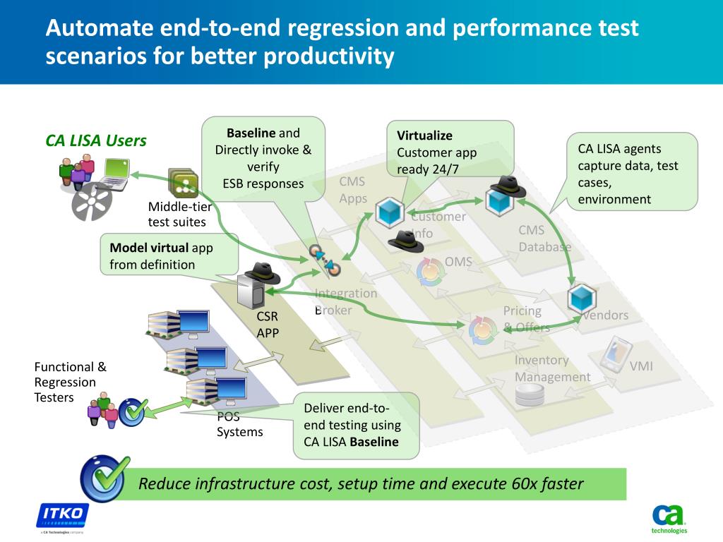 Automate end-to-end regression and performance test scenarios for better productivity Baseline and Directly invoke & verify ESB responses Virtualize Customer app ready 24/7 CA LISA Users CA LISA agents capture data, test cases, environment CMSApps Middle-tiertest suites Customer Info CMS Database Model virtual app from definition OMS IntegrationBroker CSRAPP Pricing & Offers Vendors Inventory Management VMI Functional & RegressionTesters Deliver end-to-end testing using CA LISA Baseline POSSystems Reduce infrastructure cost, setup time and execute 60x faster