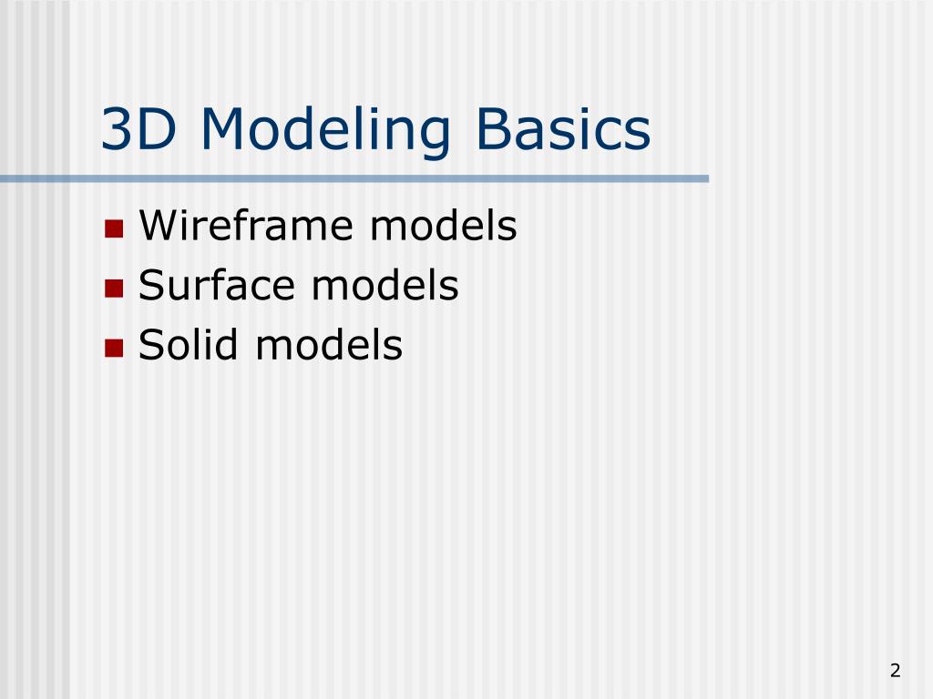 3D Modeling Basics • Wireframe models • Surface models • Solid models