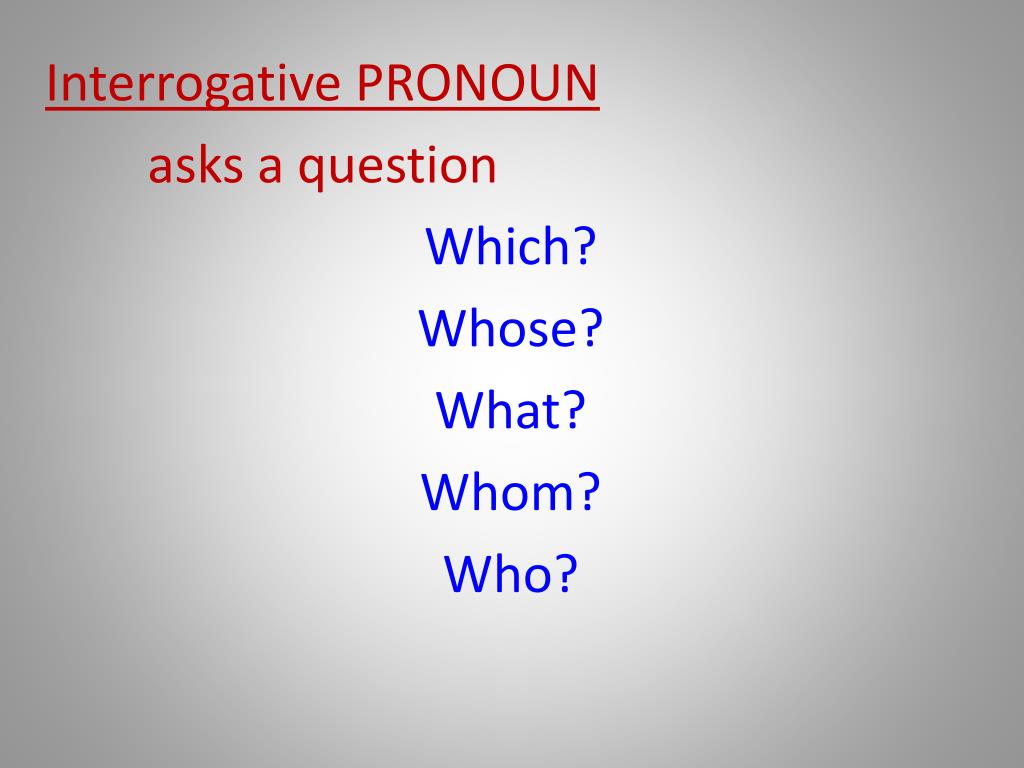 Interrogative PRONOUN asks a question Which? Whose? What? Whom? Who?