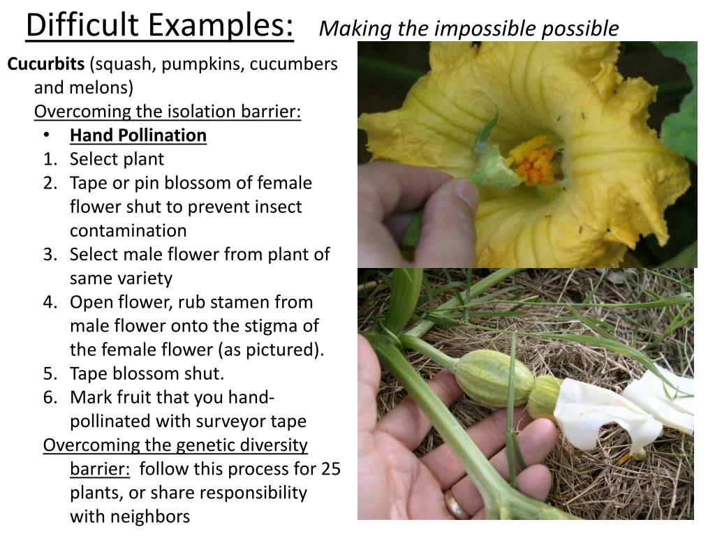 Difficult Examples:Making the impossible possible Cucurbits (squash, pumpkins, cucumbers and melons) Overcoming the isolation barrier: • Hand Pollination • Select plant • Tape or pin blossom of female flower shut to prevent insect contamination • Select male flower from plant of same variety • Open flower, rub stamen from male flower onto the stigma of the female flower (as pictured). • Tape blossom shut. • Mark fruit that you hand-pollinated with surveyor tape Overcoming the genetic diversity barrier: follow this process for 25 plants, or share responsibility with neighbors