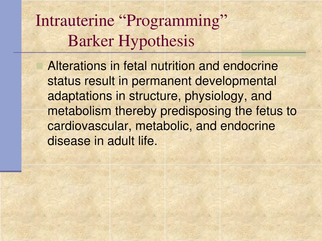 Intrauterine “Programming” Barker Hypothesis • Alterations in fetal nutrition and endocrine status result in permanent developmental adaptations in structure, physiology, and metabolism thereby predisposing the fetus to cardiovascular, metabolic, and endocrine disease in adult life.