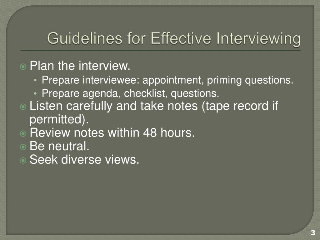 Guidelines for Effective Interviewing • Plan the interview. • Prepare interviewee: appointment, priming questions. • Prepare agenda, checklist, questions. • Listen carefully and take notes (tape record if permitted). • Review notes within 48 hours. • Be neutral. • Seek diverse views.