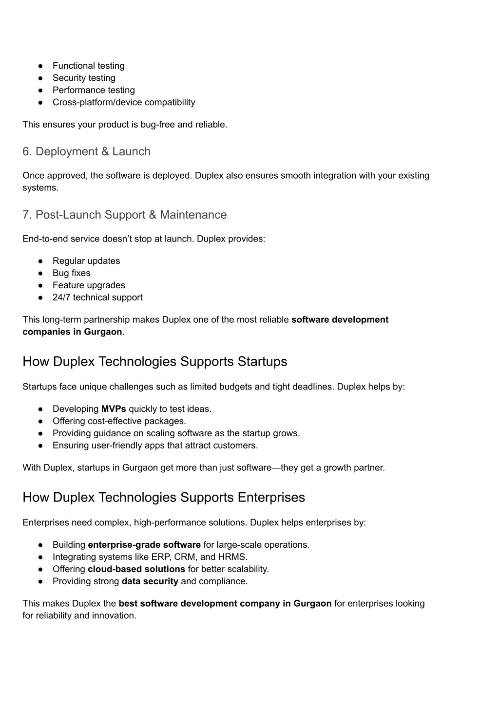 ● Functional testing ● Security testing ● Performance testing ● Cross-platform/device compatibility This ensures your product is bug-free and reliable. 6. Deployment & Launch Once approved, the software is deployed. Duplex also ensures smooth integration with your existing systems. 7. Post-Launch Support & Maintenance End-to-end service doesn’t stop at launch. Duplex provides: ● Regular updates ● Bug fixes ● Feature upgrades ● 24/7 technical support This long-term partnership makes Duplex one of the most reliable software development companies in Gurgaon. How Duplex Technologies Supports Startups Startups face unique challenges such as limited budgets and tight deadlines. Duplex helps by: ● Developing MVPs quickly to test ideas. ● Offering cost-effective packages. ● Providing guidance on scaling software as the startup grows. ● Ensuring user-friendly apps that attract customers. With Duplex, startups in Gurgaon get more than just software—they get a growth partner. How Duplex Technologies Supports Enterprises Enterprises need complex, high-performance solutions. Duplex helps enterprises by: ● Building enterprise-grade software for large-scale operations. ● Integrating systems like ERP, CRM, and HRMS. ● Offering cloud-based solutions for better scalability. ● Providing strong data security and compliance. This makes Duplex the best software development company in Gurgaon for enterprises looking for reliability and innovation.