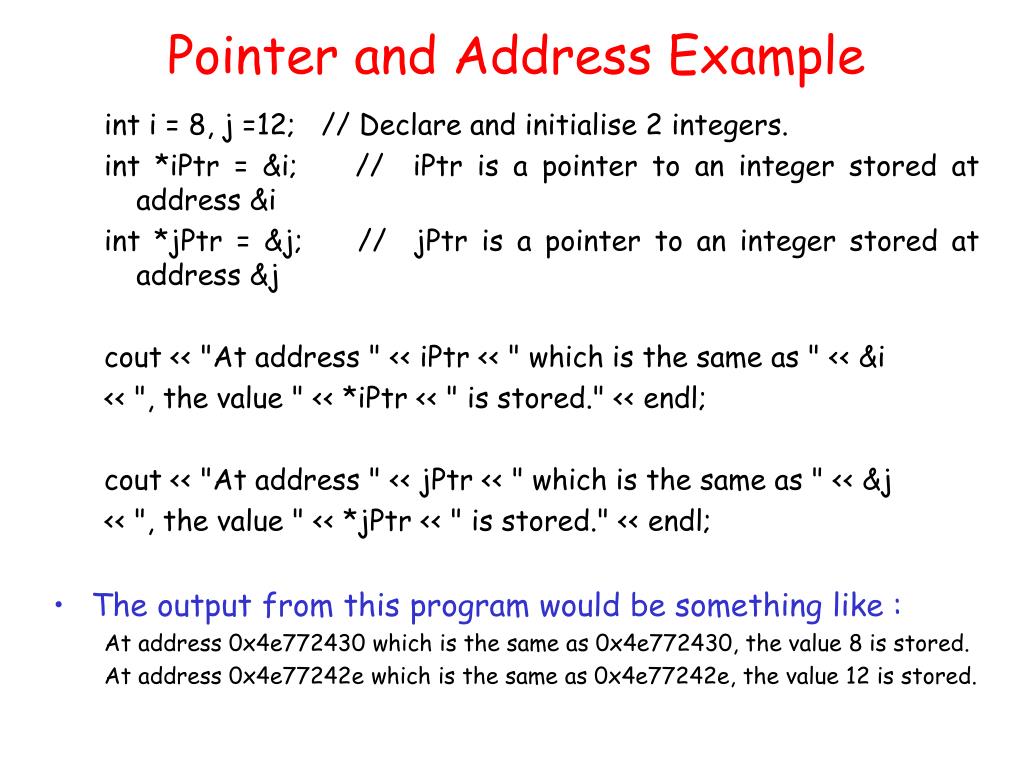 Pointer and Address Example int i = 8, j =12; // Declare and initialise 2 integers. int *iPtr = &i; // iPtr is a pointer to an integer stored at address &i int *jPtr = &j; // jPtr is a pointer to an integer stored at address &j cout << "At address " << iPtr << " which is the same as " << &i << ", the value " << *iPtr << " is stored." << endl; cout << "At address " << jPtr << " which is the same as " << &j << ", the value " << *jPtr << " is stored." << endl; • The output from this program would be something like : At address 0x4e772430 which is the same as 0x4e772430, the value 8 is stored. At address 0x4e77242e which is the same as 0x4e77242e, the value 12 is stored.