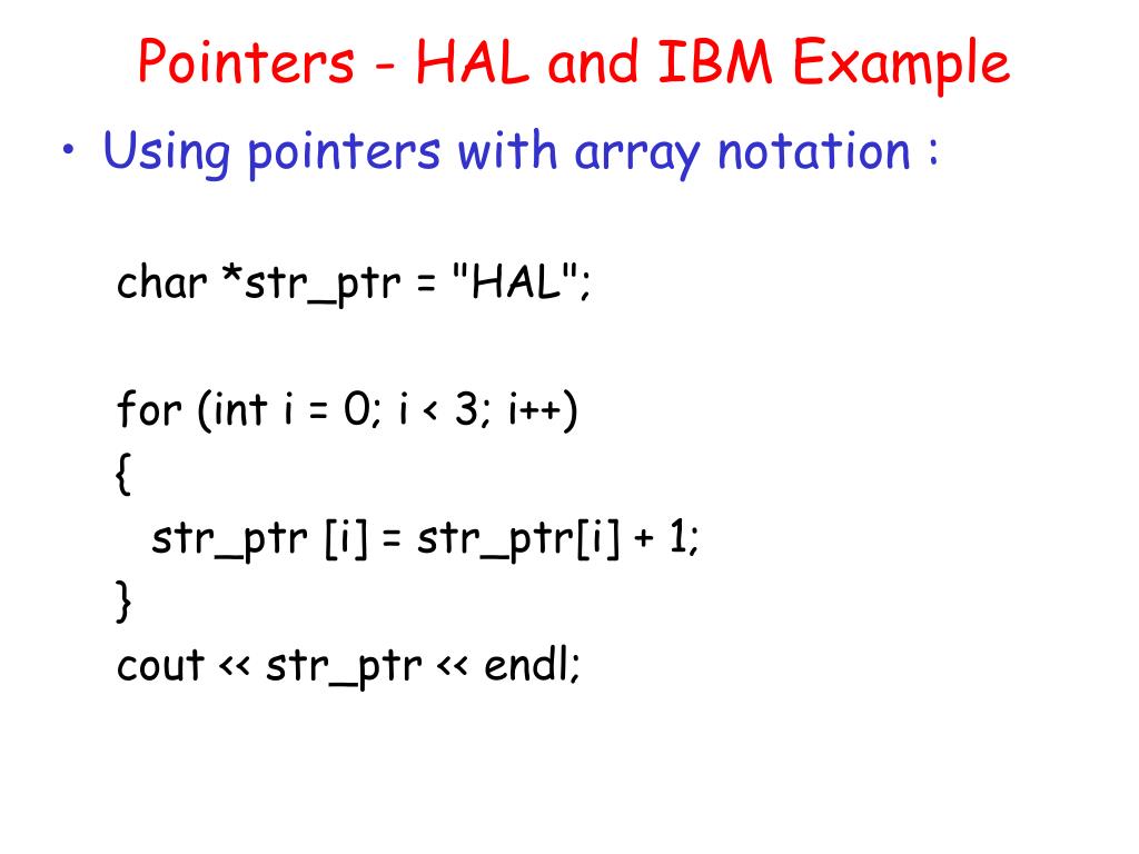 Pointers - HAL and IBM Example • Using pointers with array notation : char *str_ptr = "HAL"; for (int i = 0; i < 3; i++) { str_ptr [i] = str_ptr[i] + 1; } cout << str_ptr << endl;