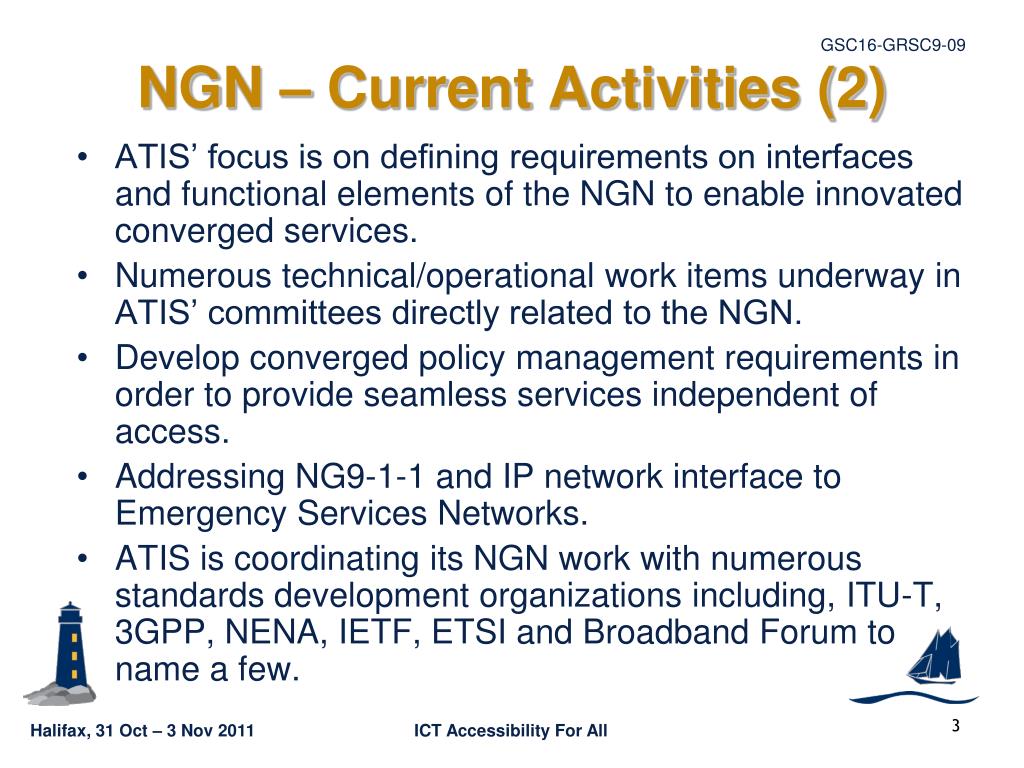 NGN – Current Activities (2) • ATIS’ focus is on defining requirements on interfaces and functional elements of the NGN to enable innovated converged services. • Numerous technical/operational work items underway in ATIS’ committees directly related to the NGN. • Develop converged policy management requirements in order to provide seamless services independent of access. • Addressing NG9-1-1 and IP network interface to Emergency Services Networks. • ATIS is coordinating its NGN work with numerous standards development organizations including, ITU-T, 3GPP, NENA, IETF, ETSI and Broadband Forum to name a few.
