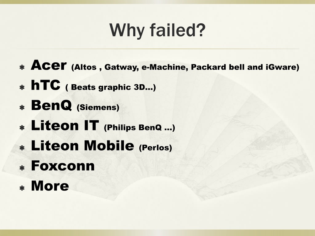 Why failed? Acer (Altos , Gatway, e-Machine, Packard bell and iGware) hTC( Beats graphic 3D…) BenQ(Siemens) Liteon IT (Philips BenQ …) Liteon Mobile (Perlos) Foxconn More
