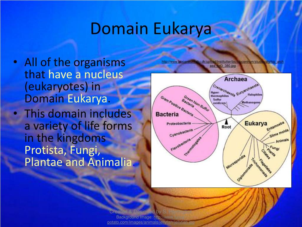 Domain Eukarya • All of the organisms that have a nucleus (eukaryotes) in Domain Eukarya. • This domain includes a variety of life forms in the kingdoms Protista, Fungi, Plantae and Animalia. http://www.biocentrum.dtu.dk/upload/institutter/bic/biocentrum/studievalg/his_archaea_fot3_380.jpg Created & Designed by S. Harrington Background Image: http://www.funny-potato.com/images/animals/jellyfish/jellyfish.jpg