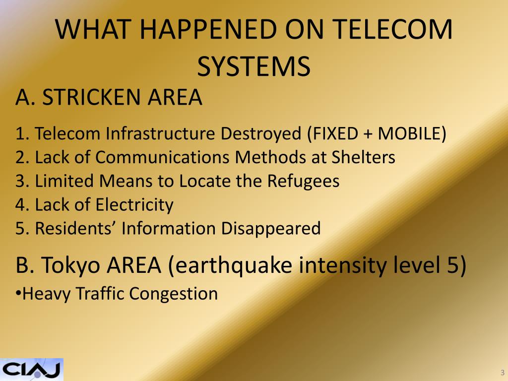 WHAT HAPPENED ON TELECOM SYSTEMS A. STRICKEN AREA 1. Telecom Infrastructure Destroyed (FIXED + MOBILE) 2. Lack of Communications Methods at Shelters 3. Limited Means to Locate the Refugees 4. Lack of Electricity 5. Residents’ Information Disappeared B. Tokyo AREA (earthquake intensity level 5) • Heavy Traffic Congestion