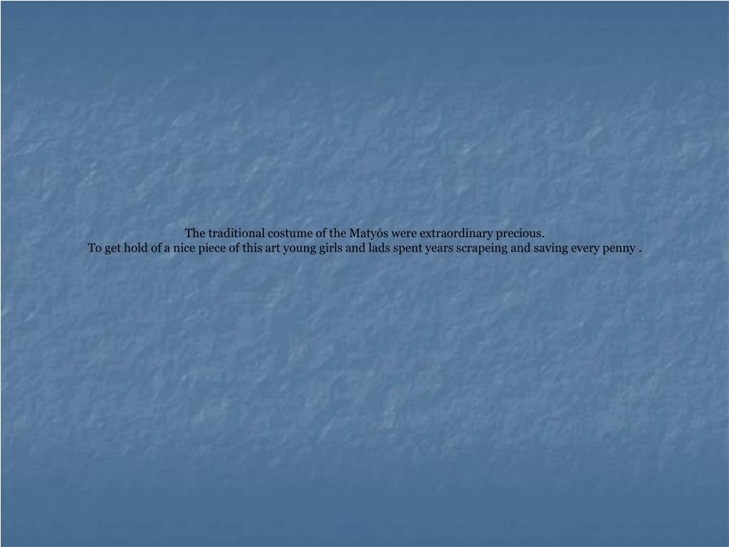 The traditional costume of the Matyós were extraordinary precious. To get hold of a nice piece of this art young girls and lads spent years scrapeing and saving every penny .