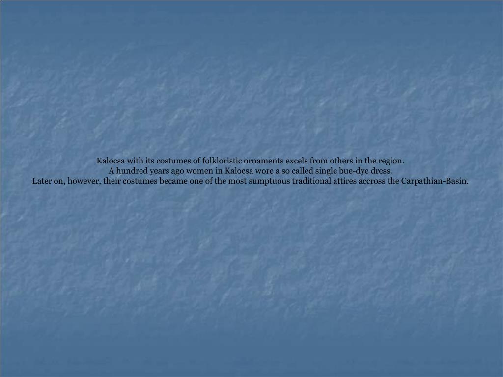 Kalocsa with its costumes of folkloristic ornaments excels from others in the region. A hundred years ago women in Kalocsa wore a so called single bue-dye dress. Later on, however, their costumes became one of the most sumptuous traditional attires accross the Carpathian-Basin.