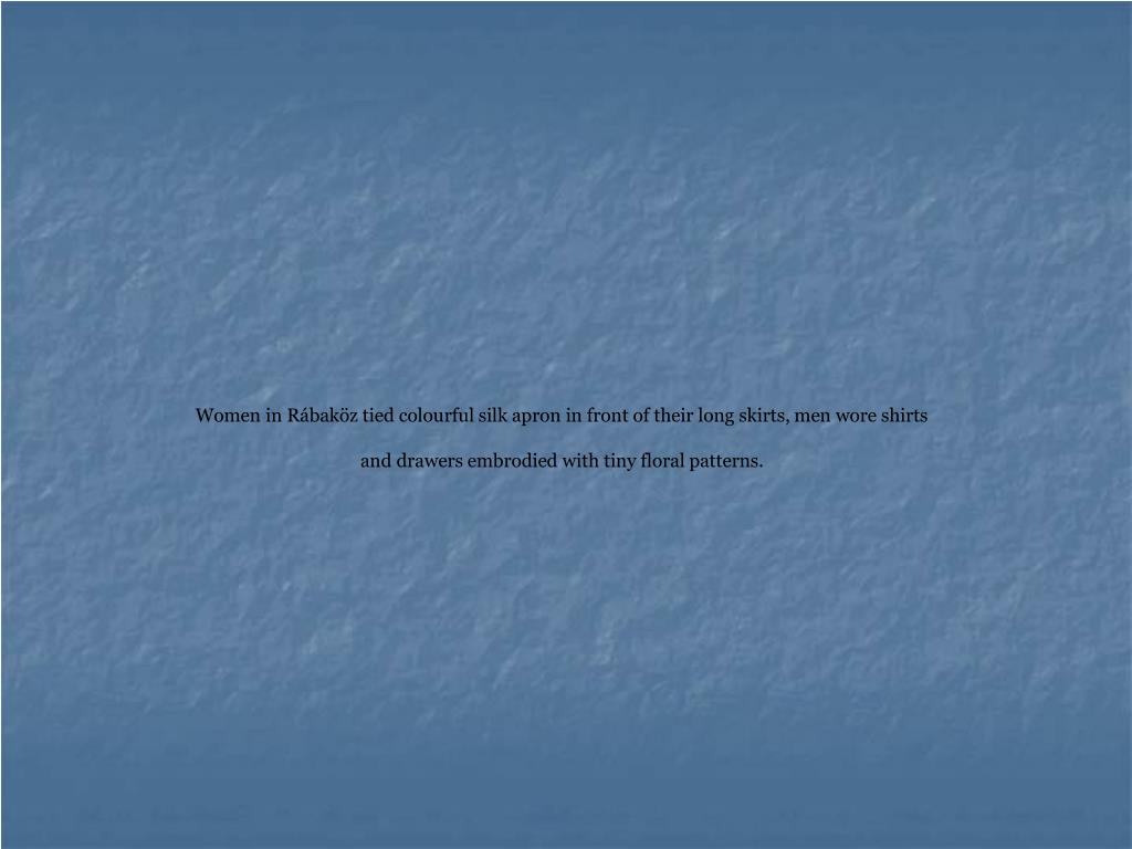 Women in Rábaköz tied colourful silk apron in front of their long skirts, men wore shirts and drawers embrodied with tiny floral patterns.
