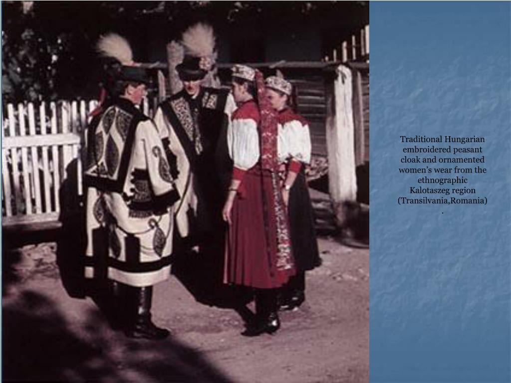 Traditional Hungarian Costumes. Hungarians (and also their ethnic groups living beyond the current frontiers in the Carpathian-Basin) are well known for their remarkably ornamented and richly coloured traditional costumes, varying by ethnographic regions, age and gender of the wearer.
