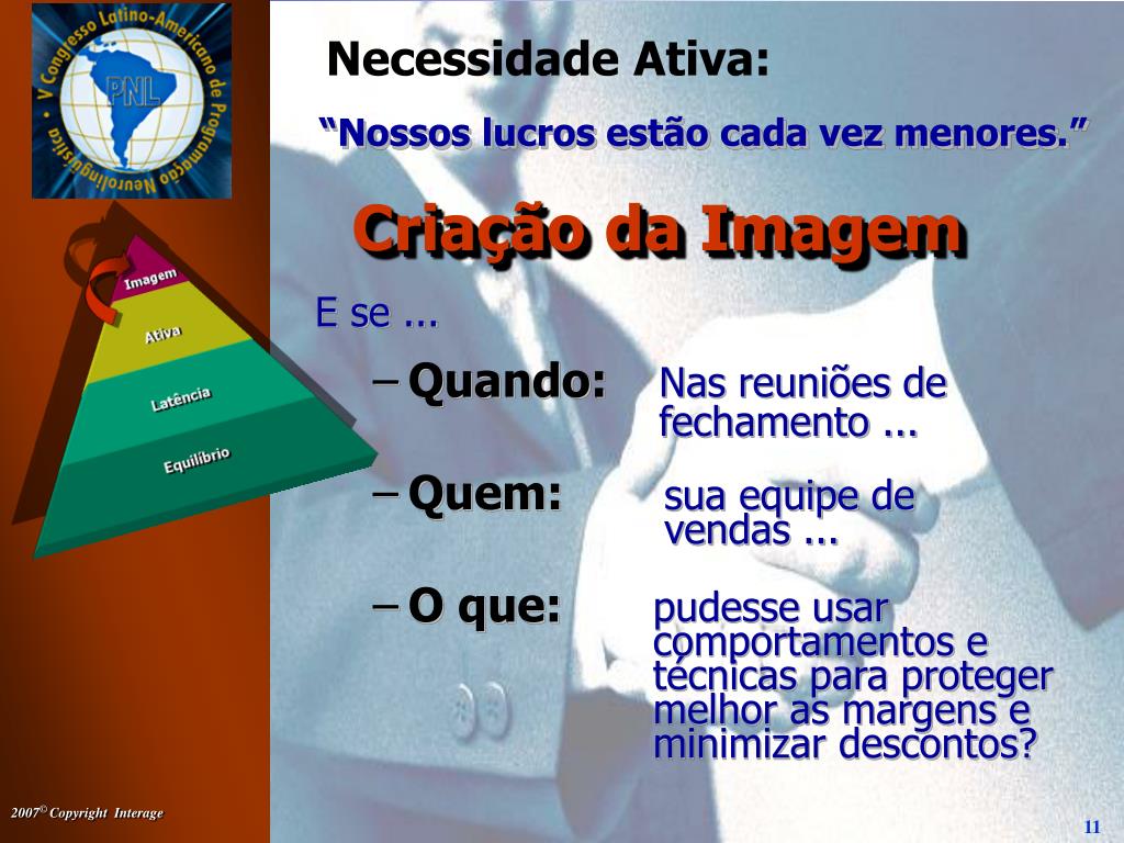 Quando: Quem: O que: Necessidade Ativa: “Nossos lucros estão cada vez menores.” Criação da Imagem E se ... Nas reuniões de fechamento ... sua equipe de vendas ... pudesse usar comportamentos e técnicas para proteger melhor as margens e minimizar descontos?