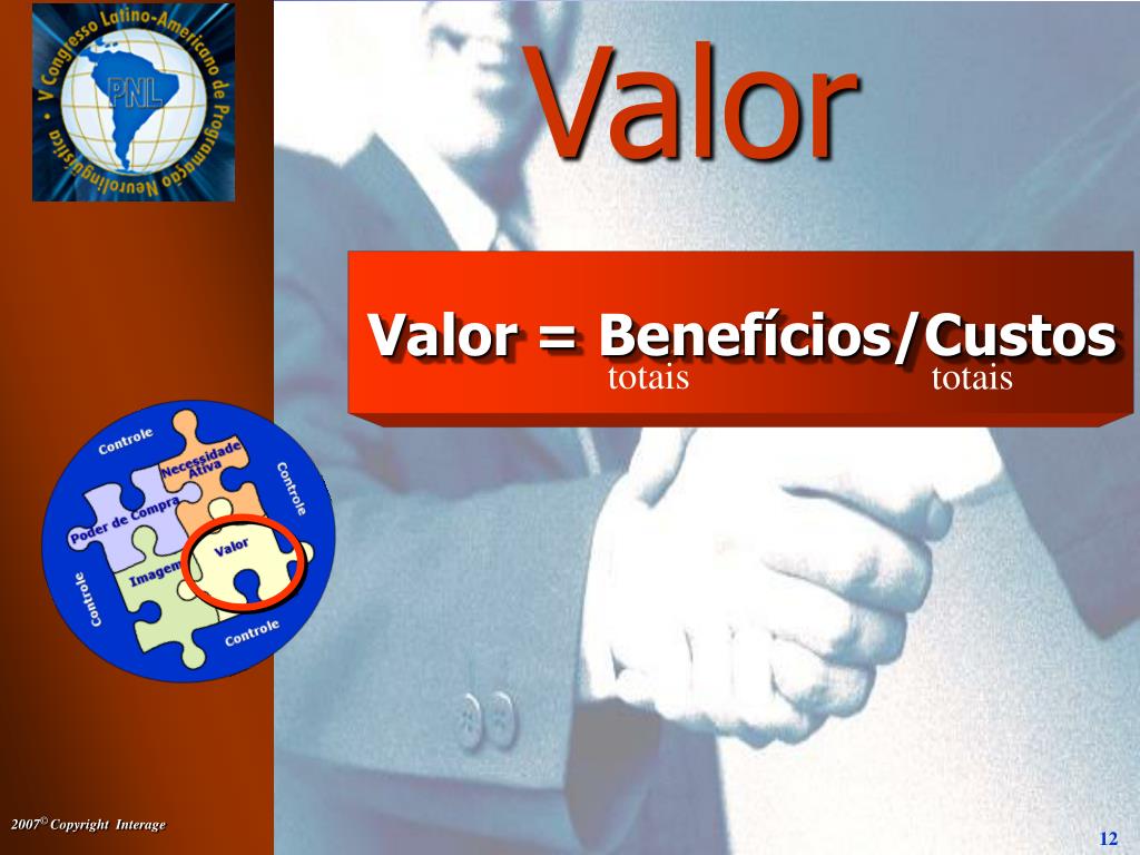 Valor Valor = Benefícios/Custos totais totais