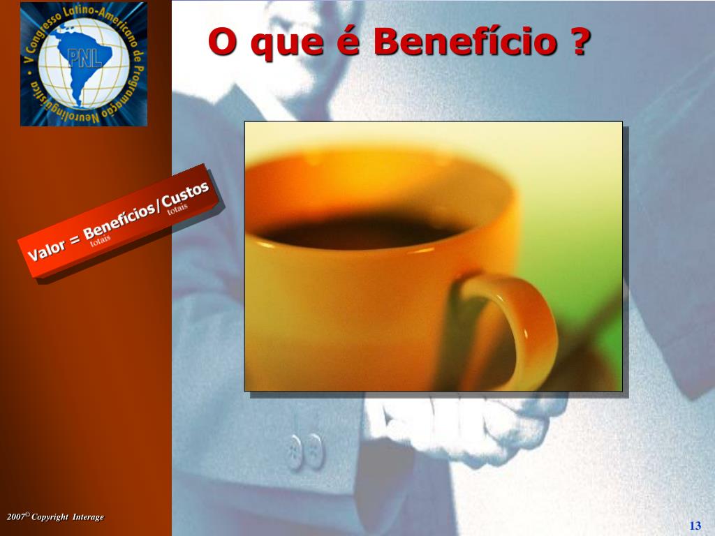 O que é Benefício ? • Declaração de Benefício: • Afirmação feita pelo vendedor que indica que seu produto ou serviço satisfaz uma necessidade expressa pelo Cliente. • Somente é um Benefício quando o Cliente verbaliza uma determinada necessidade. • O Cliente percebe(sente, vê e ouve) quando e como aquele produto atende sua Necessidade Ativa. (Imagem) “Esta xícara de café tem uma ALÇA que evitará que você queime seus dedos enquanto bebe café, que você disse que gostaria de evitar.”