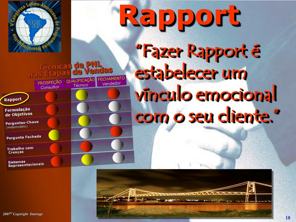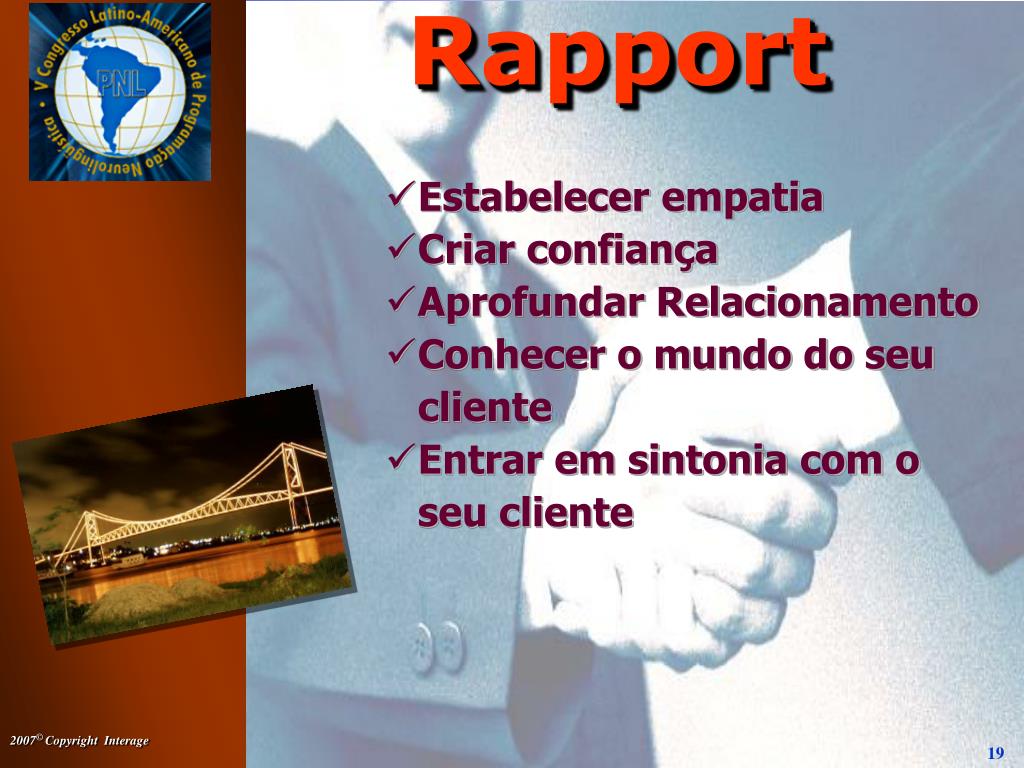 Rapport • Estabelecer empatia • Criar confiança • Aprofundar Relacionamento • Conhecer o mundo do seu cliente • Entrar em sintonia com o seu cliente