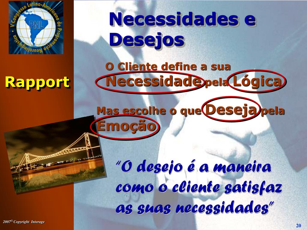 Necessidades e Desejos O Cliente define a sua Necessidade pela Lógica Rapport Mas escolhe o que Deseja pela Emoção “O desejo é a maneira como o cliente satisfaz as suas necessidades”