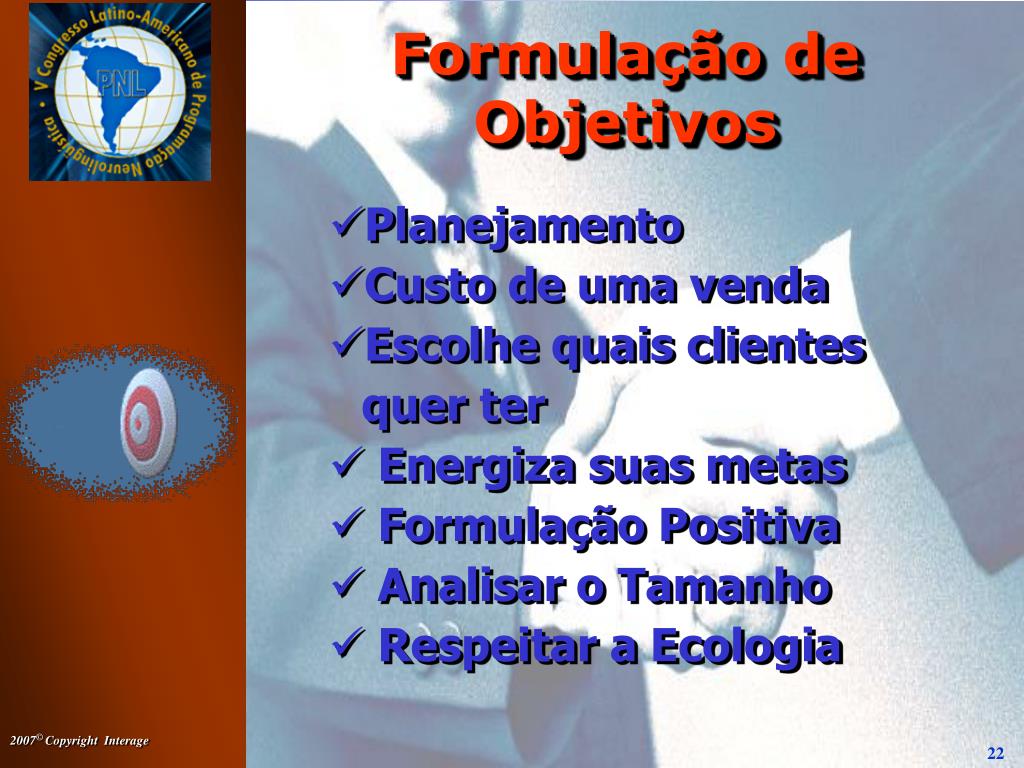Formulação de Objetivos • Planejamento • Custo de uma venda • Escolhe quais clientes quer ter • Energiza suas metas • Formulação Positiva • Analisar o Tamanho • Respeitar a Ecologia