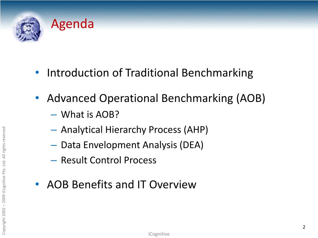 Agenda • Introduction of Traditional Benchmarking • Advanced Operational Benchmarking (AOB) • What is AOB? • Analytical Hierarchy Process (AHP) • Data Envelopment Analysis (DEA) • Result Control Process • AOB Benefits and IT Overview 2 iCognitive