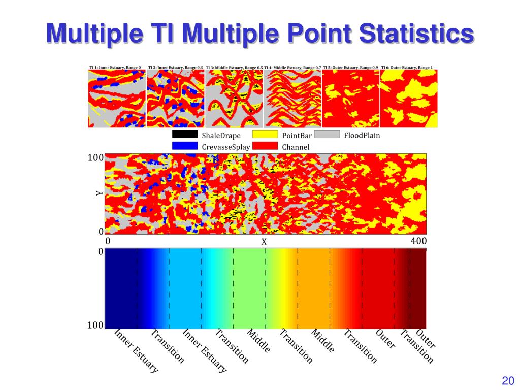Highlights from 2012: 1/3 • Multivariate modeling • Projection pursuit and direct mapping to MVN • Data replacement in Gaussian and non parametric context • Multiple point statistics • Continuous variables • Mixing training images or linked to tidal range • Important directions • Fracture and fault modeling • Processing for LVA modeling • Uncertainty and data spacing/placement
