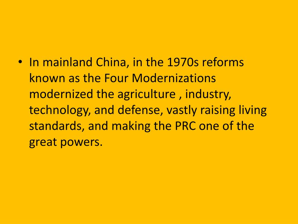 In mainland China, in the 1970s reforms known as the Four Modernizations modernized the agriculture , industry, technology, and defense, vastly raising living standards, and making the PRC one of the great powers.