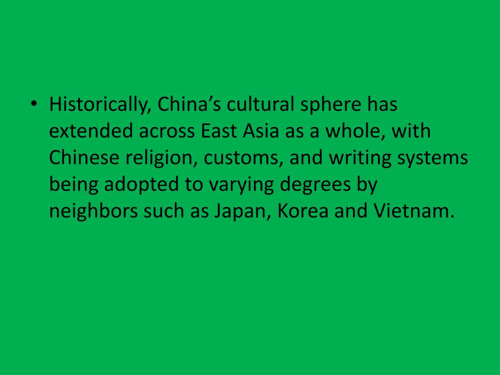 Historically, China’s cultural sphere has extended across East Asia as a whole, with Chinese religion, customs, and writing systems being adopted to varying degrees by neighbors such as Japan, Korea and Vietnam.