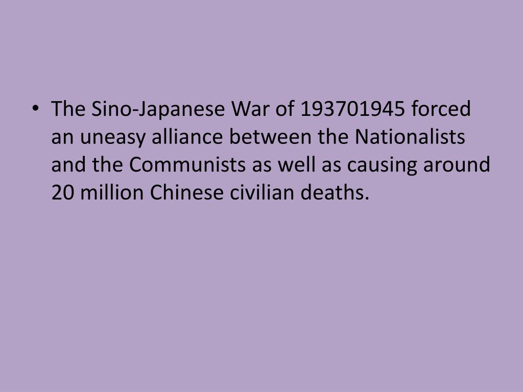 The Sino-Japanese War of 193701945 forced an uneasy alliance between the Nationalists and the Communists as well as causing around 20 million Chinese civilian deaths.