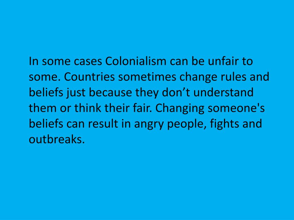 In some cases Colonialism can be unfair to some. Countries sometimes change rules and beliefs just because they don’t understand them or think their fair. Changing someone's beliefs can result in angry people, fights and outbreaks.