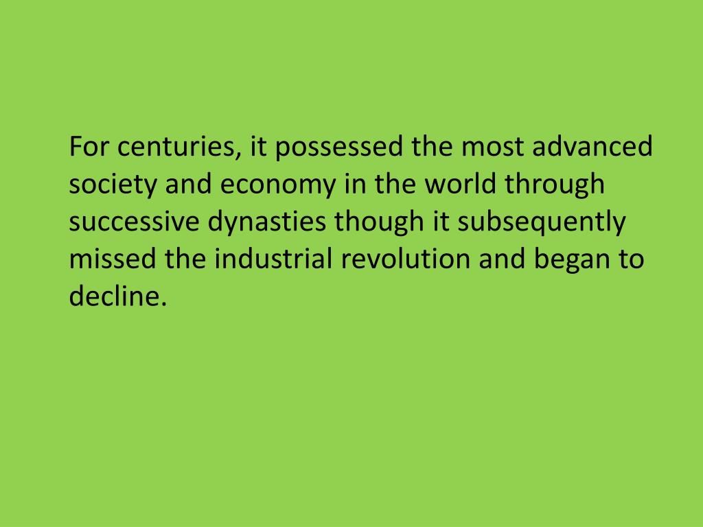 For centuries, it possessed the most advanced society and economy in the world through successive dynasties though it subsequently missed the industrial revolution and began to decline.