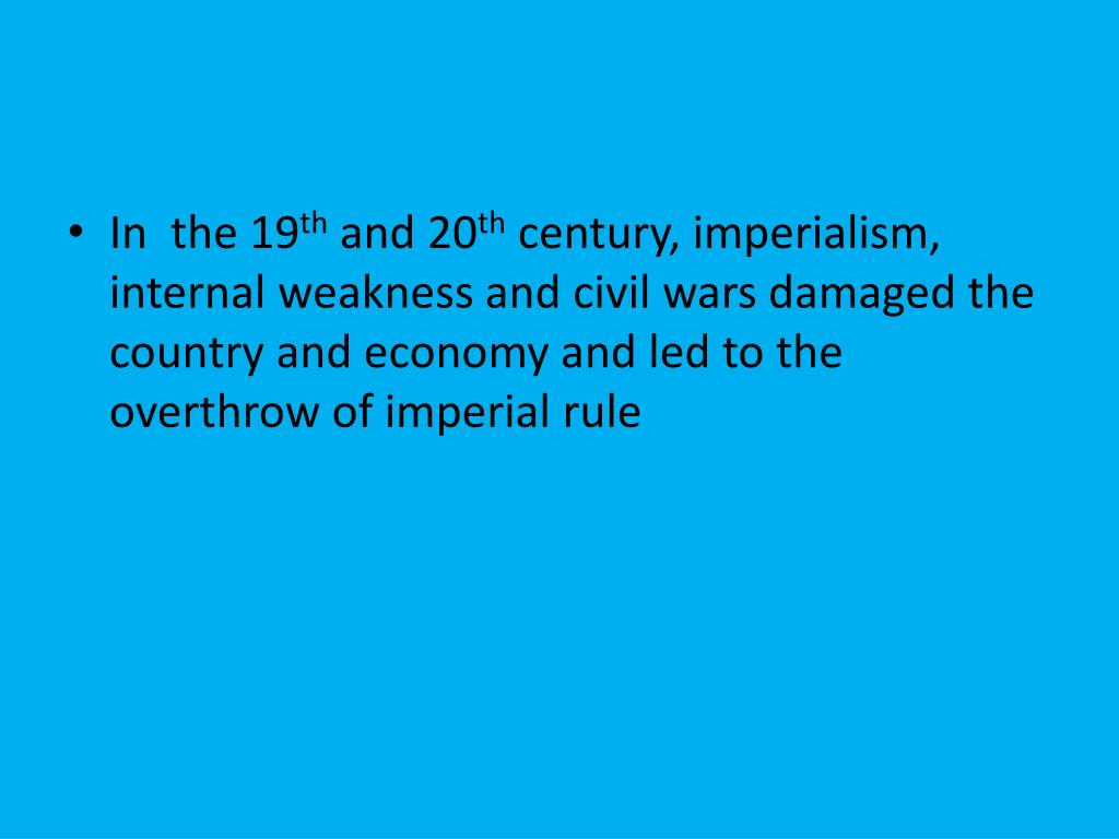 In the 19th and 20th century, imperialism, internal weakness and civil wars damaged the country and economy and led to the overthrow of imperial rule