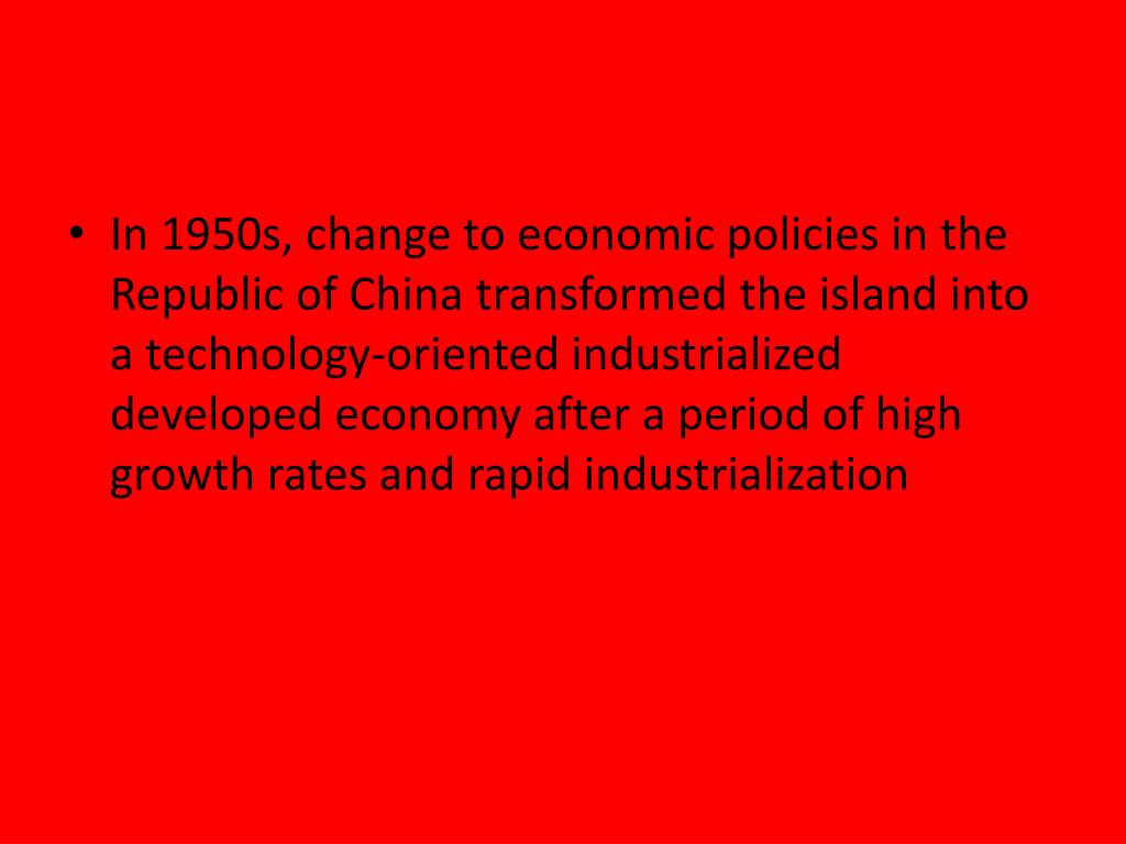 In 1950s, change to economic policies in the Republic of China transformed the island into a technology-oriented industrialized developed economy after a period of high growth rates and rapid industrialization