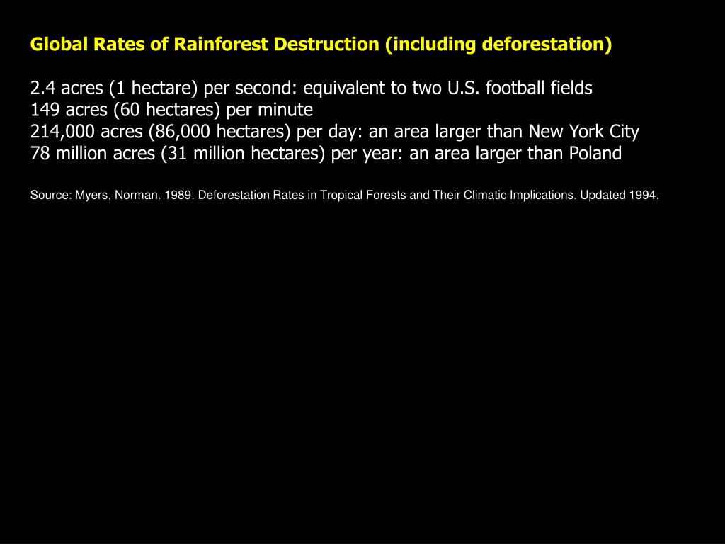 Global Rates of Rainforest Destruction (including deforestation) 2.4 acres (1 hectare) per second: equivalent to two U.S. football fields 149 acres (60 hectares) per minute 214,000 acres (86,000 hectares) per day: an area larger than New York City 78 million acres (31 million hectares) per year: an area larger than Poland Source: Myers, Norman. 1989. Deforestation Rates in Tropical Forests and Their Climatic Implications. Updated 1994.
