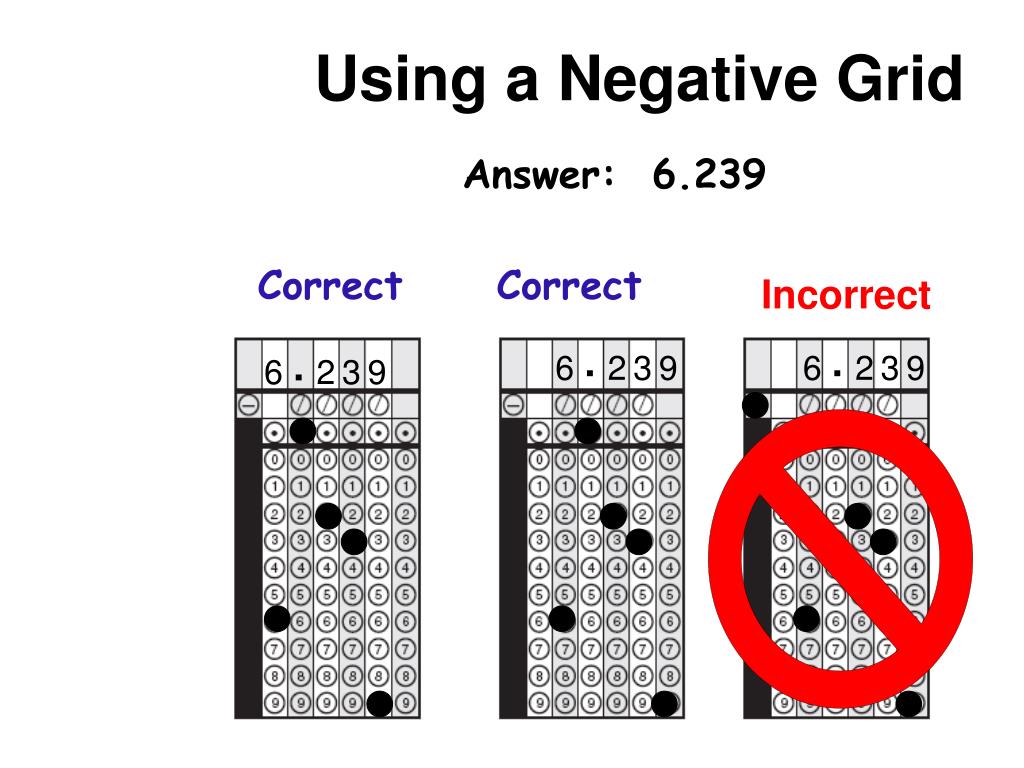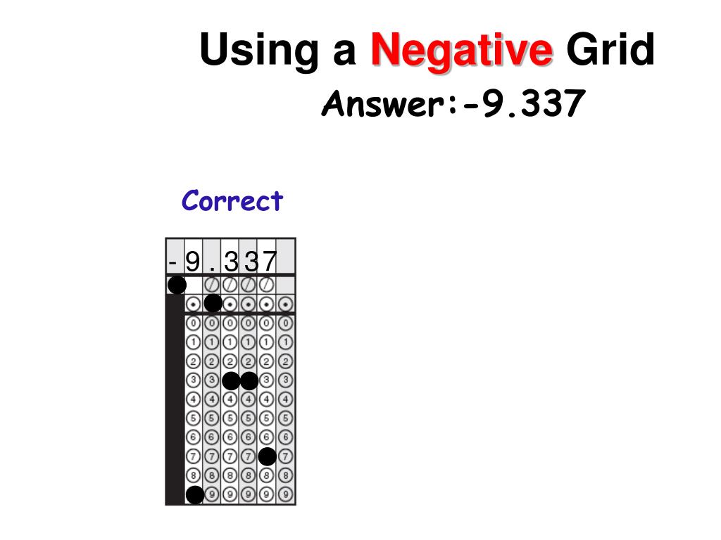 How to complete a negative grid No numbers are placed in the 1st column. If the answer is not negative, Do NOT bubble in the 1st column. Leave it blank. If the answer is negative, print only a negative sign in the 1st column. After the 1st column fill in a bubble under each box in which you wrote your answer. Fill in one and ONLY one bubble for each box. Do NOT fill in a bubble under an unused box. Fill each bubble by making a solid black mark that completely fills the circle. You MUST fill in the bubbles accurate to receive credit for your answer.