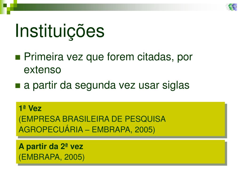 Instituições • Primeira vez que forem citadas, por extenso • a partir da segunda vez usar siglas 1ª Vez (EMPRESA BRASILEIRA DE PESQUISA AGROPECUÁRIA – EMBRAPA, 2005) A partir da 2ª vez (EMBRAPA, 2005)