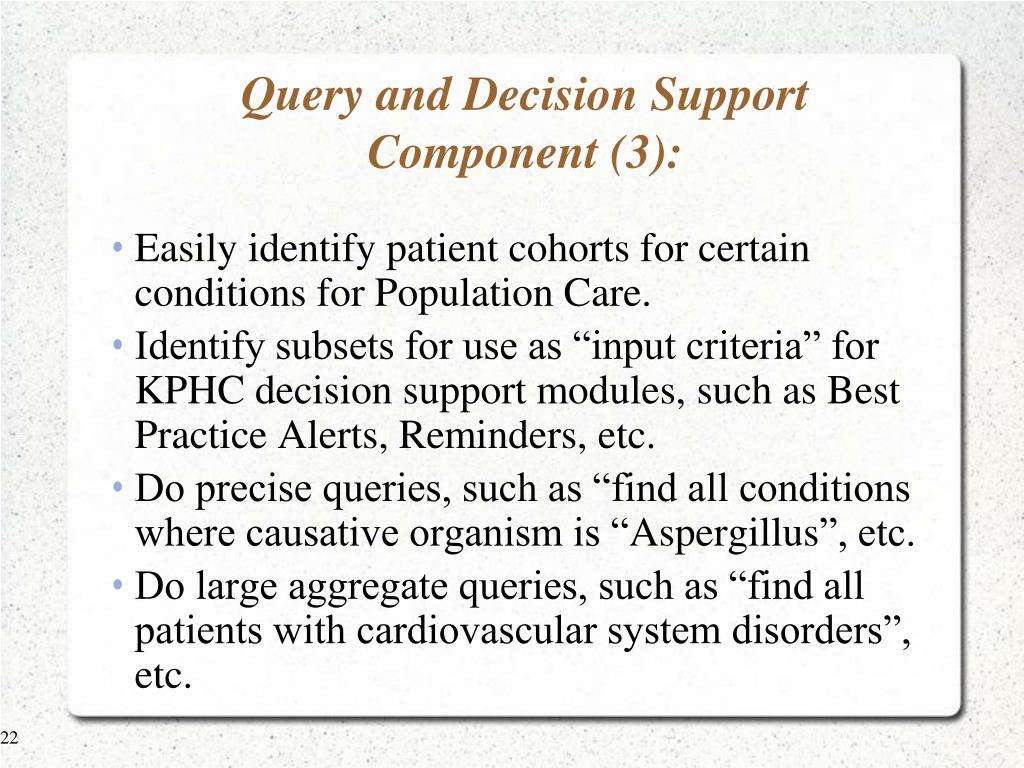 Query and Decision Support Component (3): • Easily identify patient cohorts for certain conditions for Population Care. • Identify subsets for use as “input criteria” for KPHC decision support modules, such as Best Practice Alerts, Reminders, etc. • Do precise queries, such as “find all conditions where causative organism is “Aspergillus”, etc. • Do large aggregate queries, such as “find all patients with cardiovascular system disorders”, etc.
