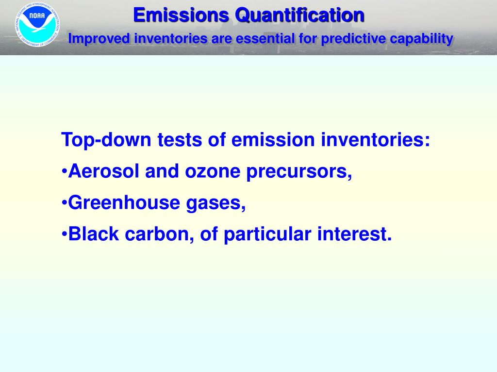 Emissions Quantification Improved inventories are essential for predictive capability • Top-down tests of emission inventories: • Aerosol and ozone precursors, • Greenhouse gases, • Black carbon, of particular interest.