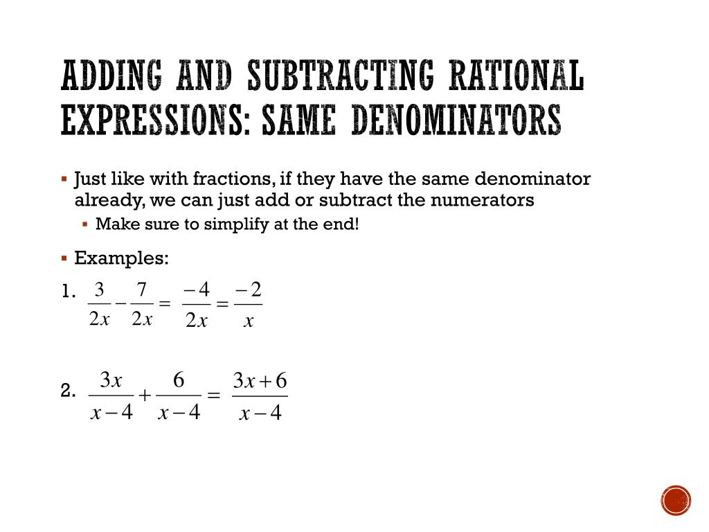 Adding and subtracting rational Expressions: Same denominators • Just like with fractions, if they have the same denominator already, we can just add or subtract the numerators • Make sure to simplify at the end! • Examples: 1. 2.