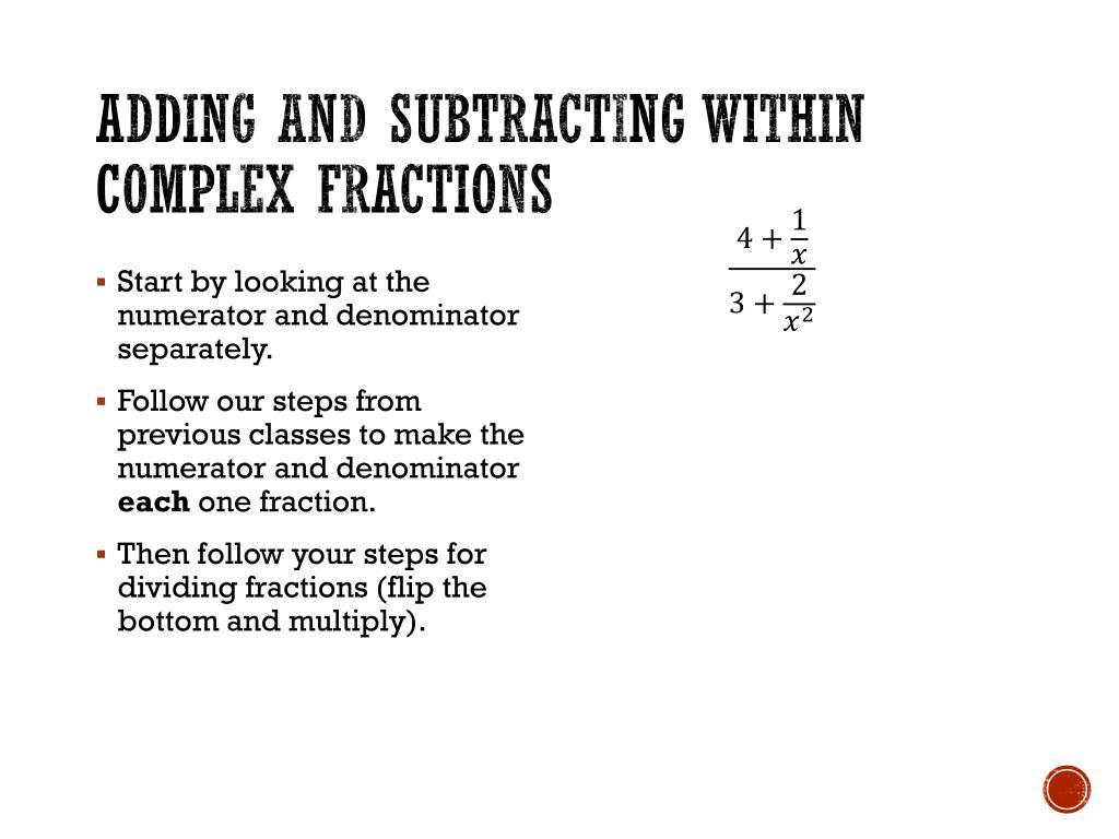 Adding and subtracting within complex fractions • Start by looking at the numerator and denominator separately. • Follow our steps from previous classes to make the numerator and denominator each one fraction. • Then follow your steps for dividing fractions (flip the bottom and multiply).