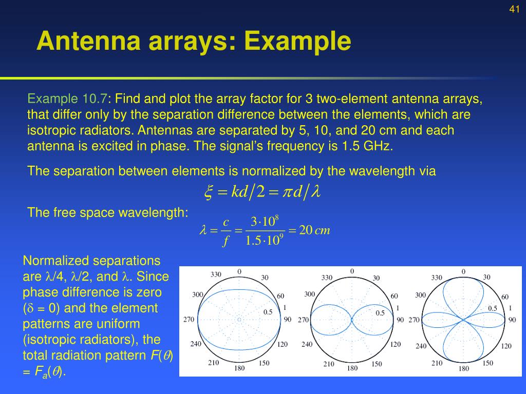 Antenna arrays: Example Example 10.7: Find and plot the array factor for 3 two-element antenna arrays, that differ only by the separation difference between the elements, which are isotropic radiators. Antennas are separated by 5, 10, and 20 cm and each antenna is excited in phase. The signal’s frequency is 1.5 GHz. The separation between elements is normalized by the wavelength via The free space wavelength: Normalized separations are /4, /2, and . Since phase difference is zero ( = 0) and the element patterns are uniform (isotropic radiators), the total radiation pattern F() = Fa().