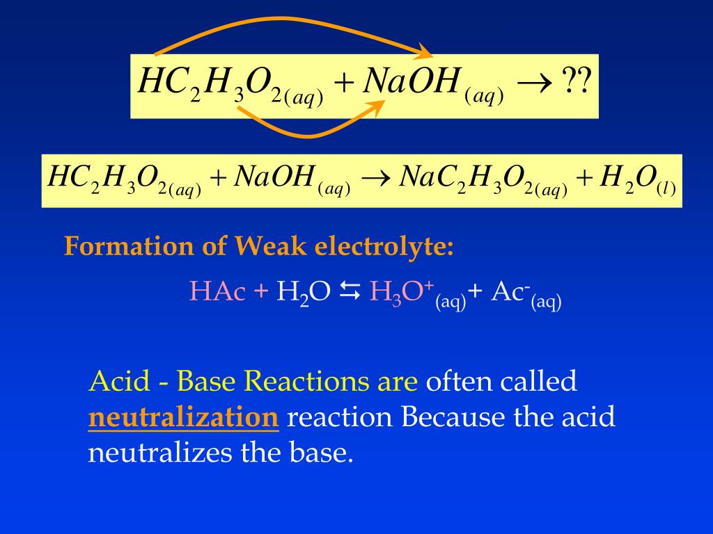 Formation of Weak electrolyte: HAc + H2O H3O+(aq)+ Ac-(aq) • Acid - Base Reactions are often called neutralizationreaction Because the acid neutralizes the base.