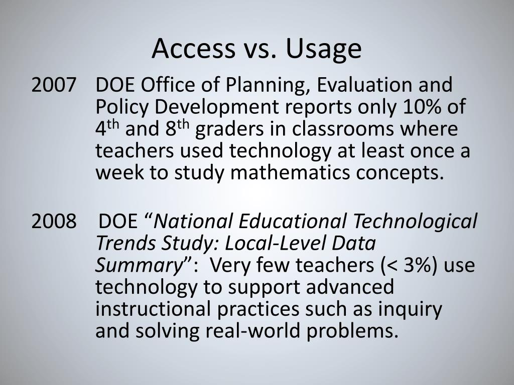 Access vs. Usage • DOE Office of Planning, Evaluation and Policy Development reports only 10% of 4th and 8th graders in classrooms where teachers used technology at least once a week to study mathematics concepts. 2008 DOE “National Educational Technological Trends Study: Local-Level Data Summary”: Very few teachers (< 3%) use technology to support advanced instructional practices such as inquiry and solving real-world problems.