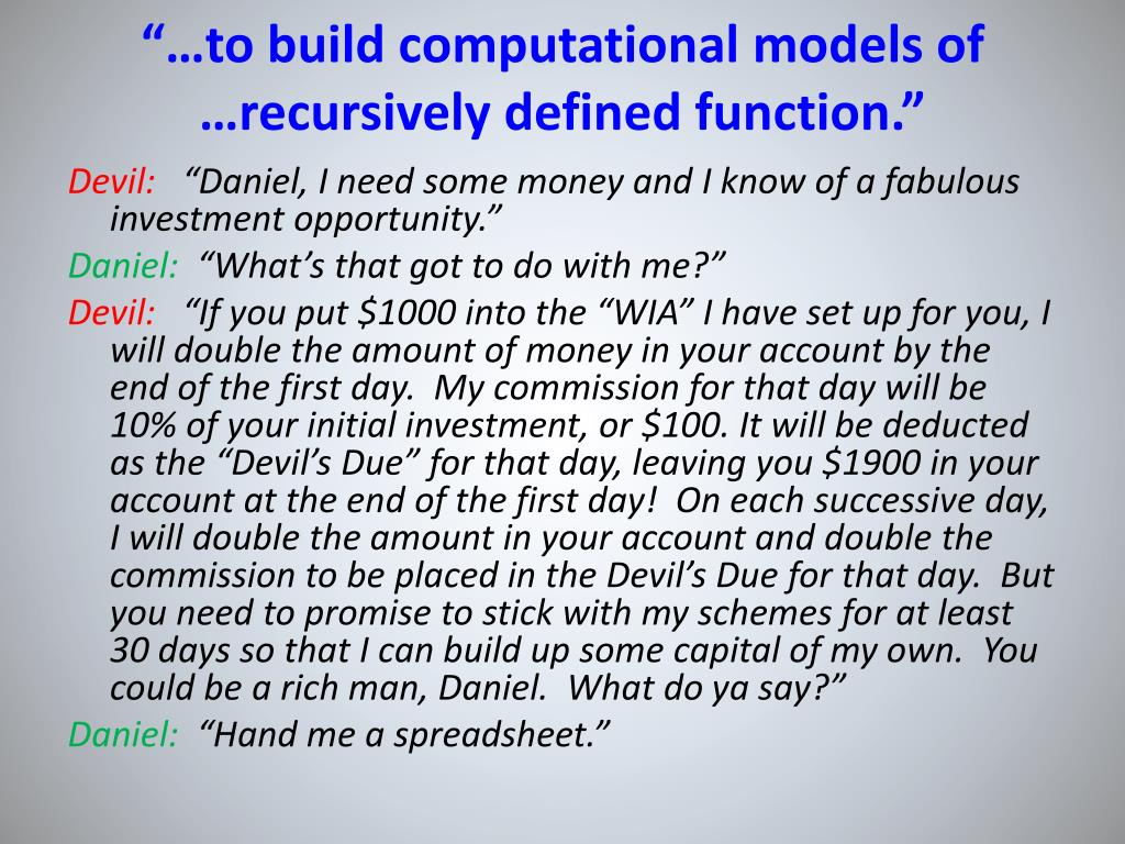 “…to build computational models of …recursively defined function.” Devil: “Daniel, I need some money and I know of a fabulous investment opportunity.” Daniel: “What’s that got to do with me?” Devil: “If you put $1000 into the “WIA” I have set up for you, I will double the amount of money in your account by the end of the first day. My commission for that day will be 10% of your initial investment, or $100. It will be deducted as the “Devil’s Due” for that day, leaving you $1900 in your account at the end of the first day! On each successive day, I will double the amount in your account and double the commission to be placed in the Devil’s Due for that day. But you need to promise to stick with my schemes for at least 30 days so that I can build up some capital of my own. You could be a rich man, Daniel. What do ya say?” Daniel:“Hand me a spreadsheet.”